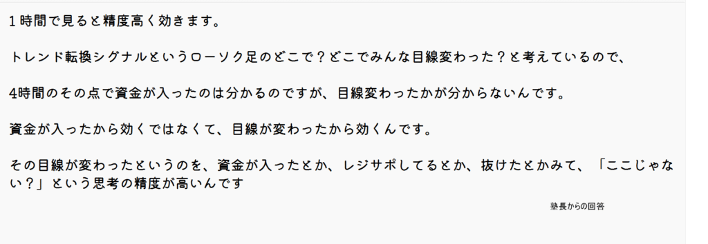 が正解は 下位足の1時間に目線を移してみて そこが、トレンド転換(トレンド継続)を起こしたと市場参加者の目線が変わった!場所