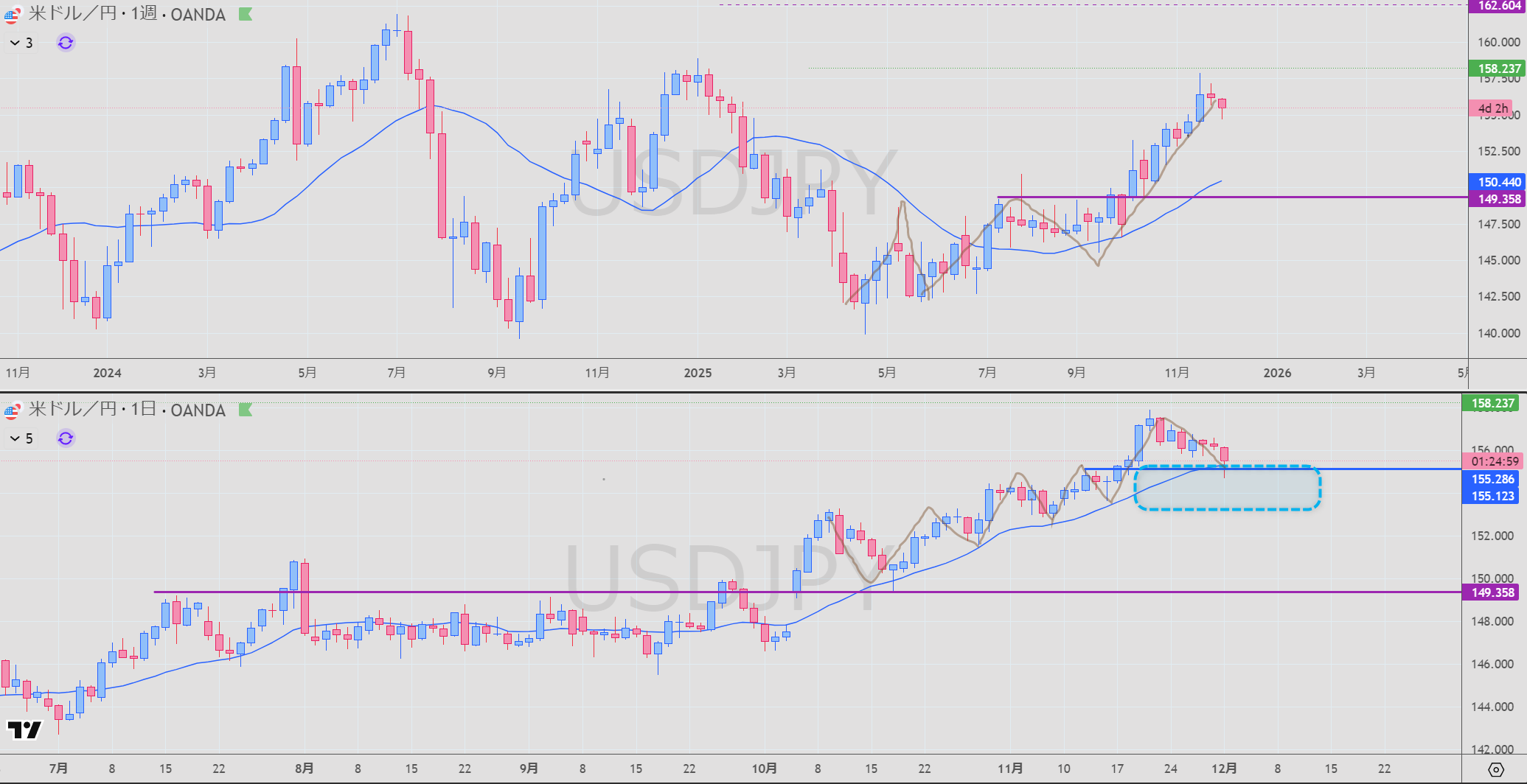 安値(買い支え)を下抜け後、現在売り抑え付近に位置