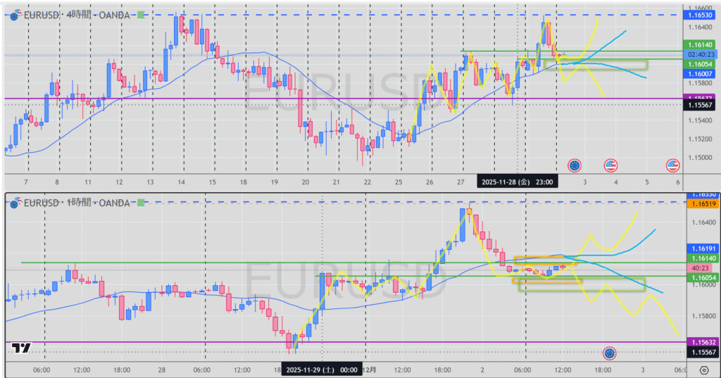 シナリオ:4時間軸でセオリーに沿うと4時間戻り売り。だが、日足の押目で止まるかどうかのところ。見極めが必要。静観