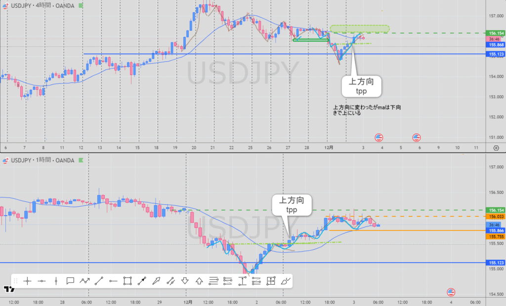 1h目線が上に変わる→4h 上昇するも下向きのmaは上に位置。このまま上昇してma上抜けて高堰を上に抜ければ、日足の押目が効いた判定していいのかな~など思いながらチャートを見ていた。