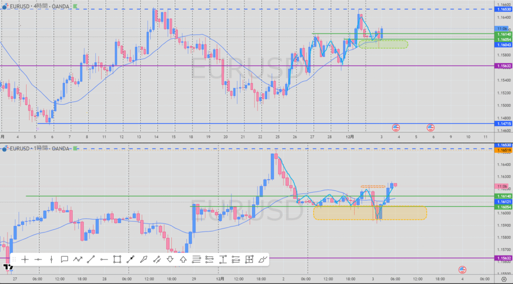 1時間:上方向 高値(売り抑え)上抜き後深く戻して調整中