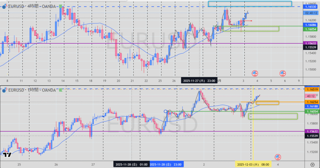 シナリオ:新規様子見。4時間セオリーでは押し目買い。