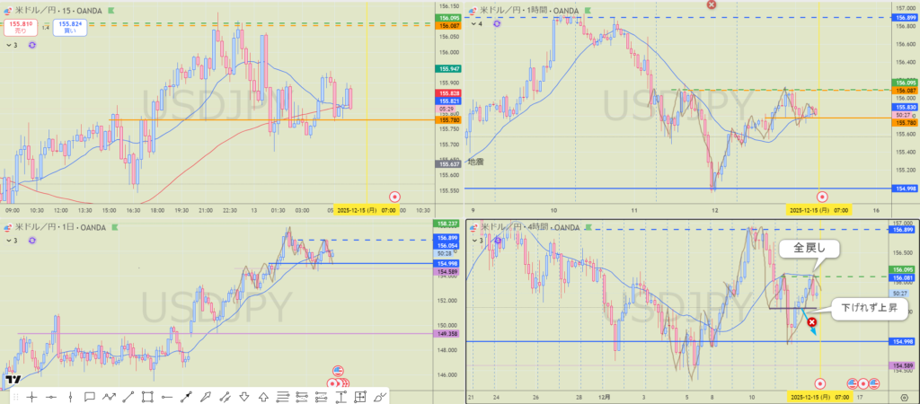 4Hは日足のサポートから4Hの高値まで全戻し。