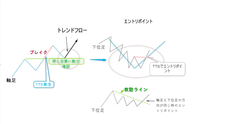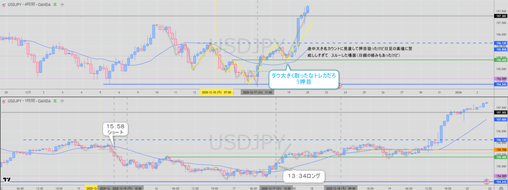 USDJPY 4Hのダウカウント細かく取ってロング取れたけど、細かく取ったらそのあとに来た押目とれない場面。