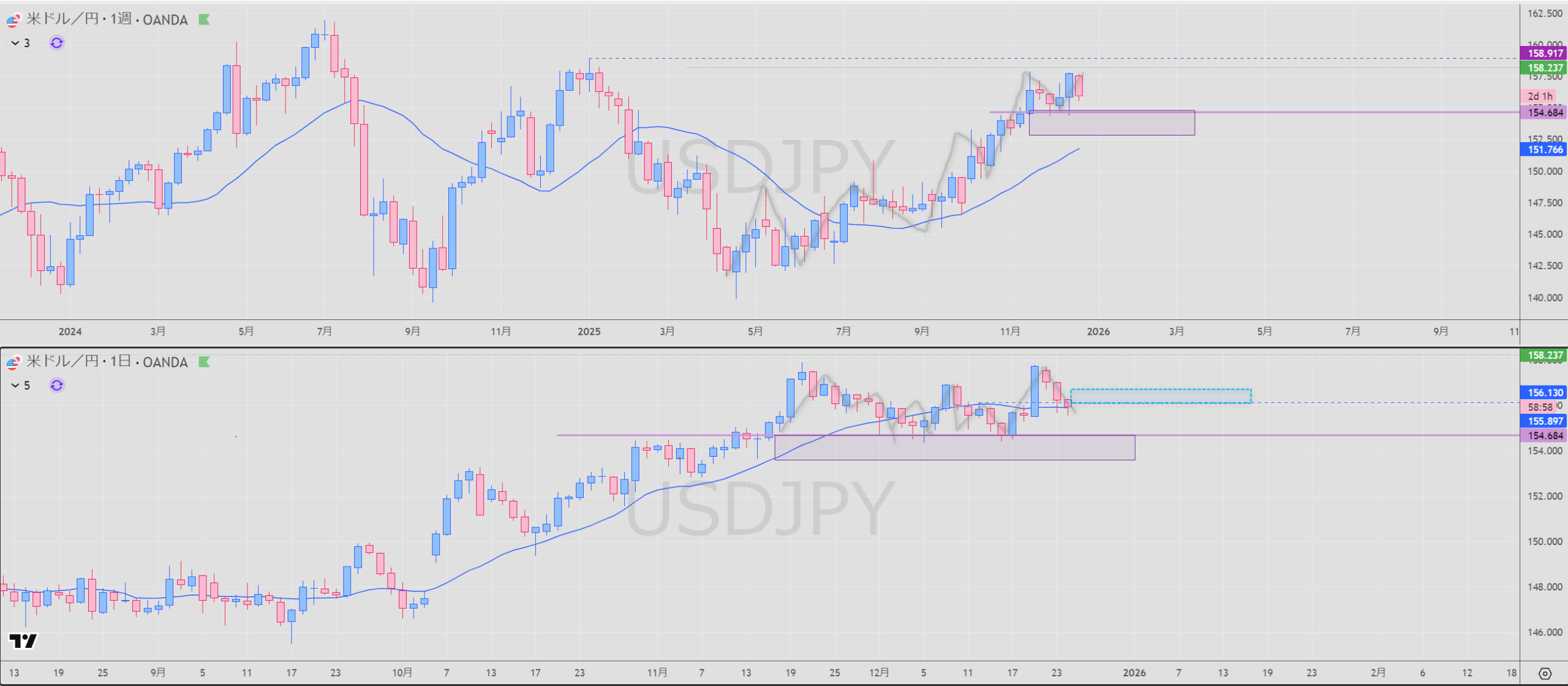 買いの場合:①4H押目まで下降し止まれば検討(MA位置と下抜きする可能性があるので要注意)