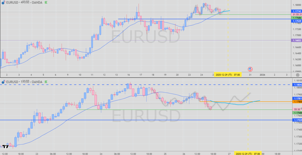 4H買い支えを下に抜けられず、MAをローソク足が上抜いたら買い検討(決して波が出やすい場面ではないので)
