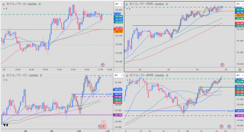 全体的に上方向だが、4時間・1時間 上に買い支えがいる