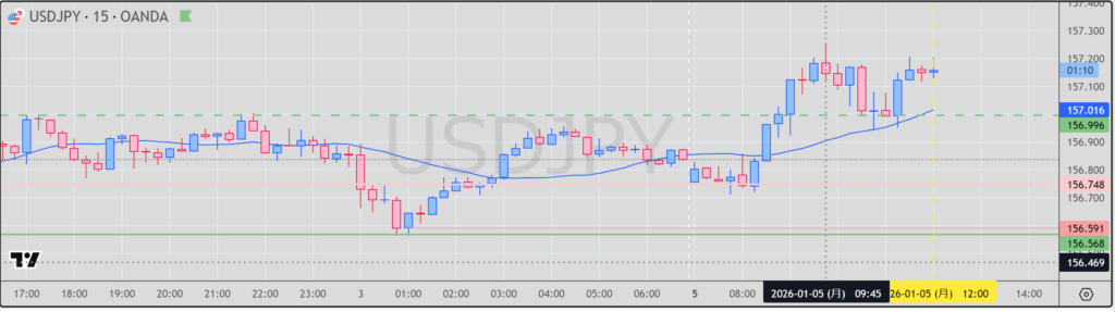 損切を15分の押し目に置き(27pip)放置。