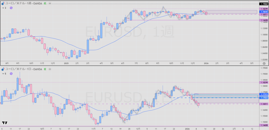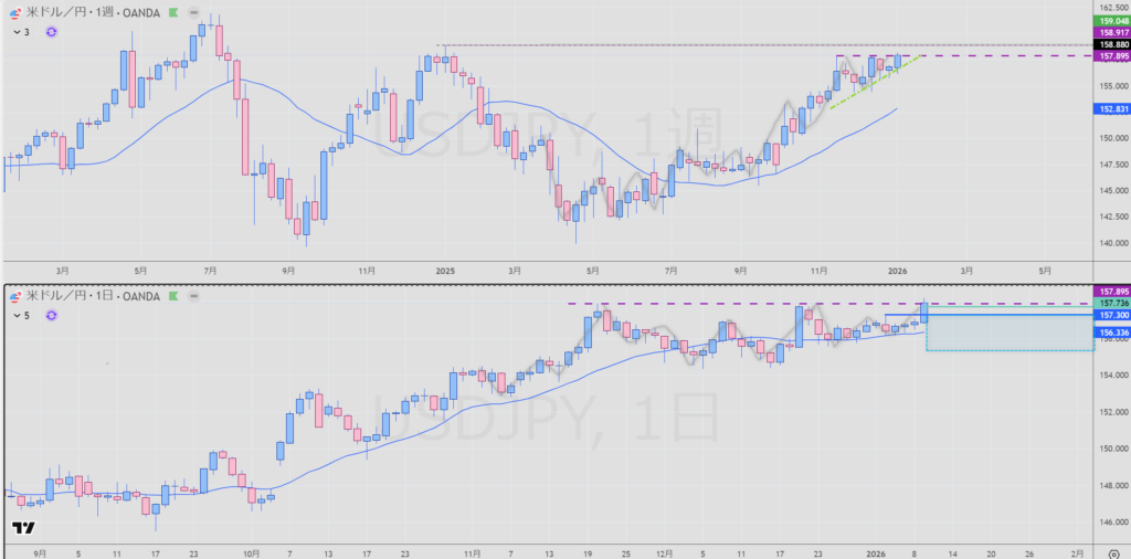 ※週足が微妙な位置。押し安値を市場参加者の多くが超えてない判定してるなら止まる可能性がある。