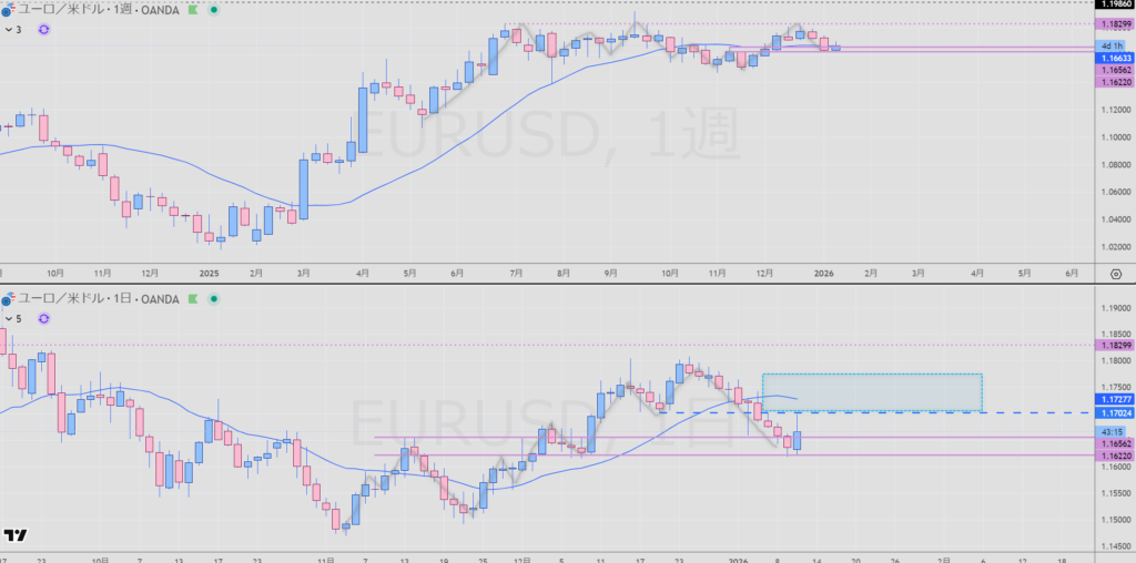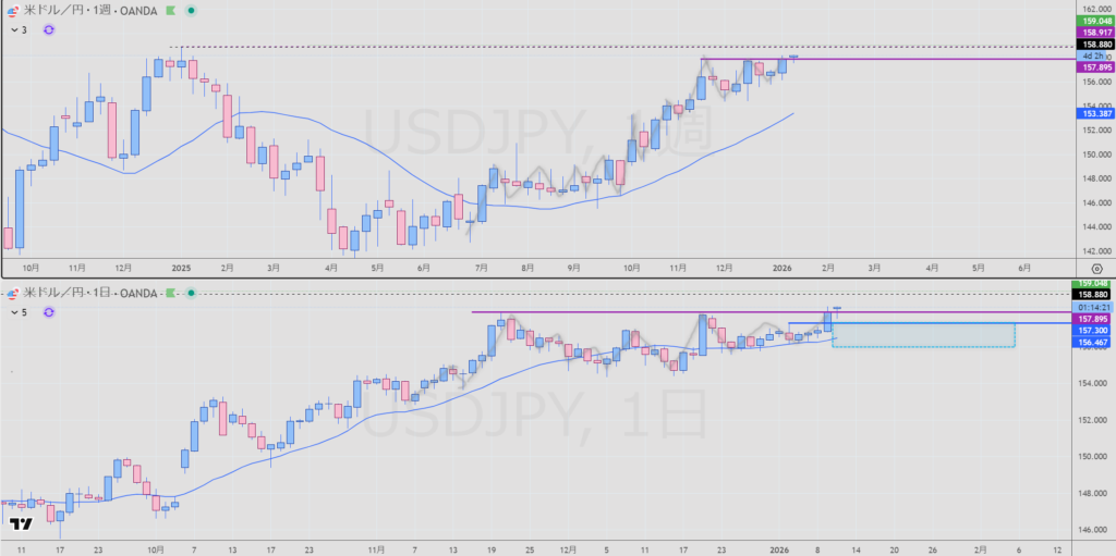 ローソク足単位で高値更新できずレンジの上限(売り抑圏)に位置