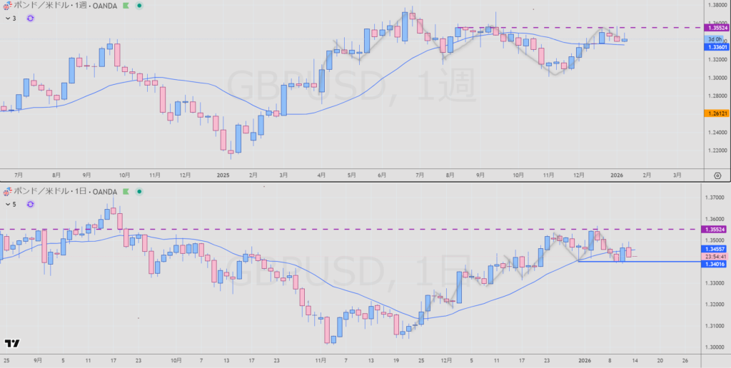 細かくカウントすれば上方向に見えるが、ごちゃごちゃしていてどこで前回高値を取ったらよいか迷うので大きく取る。
