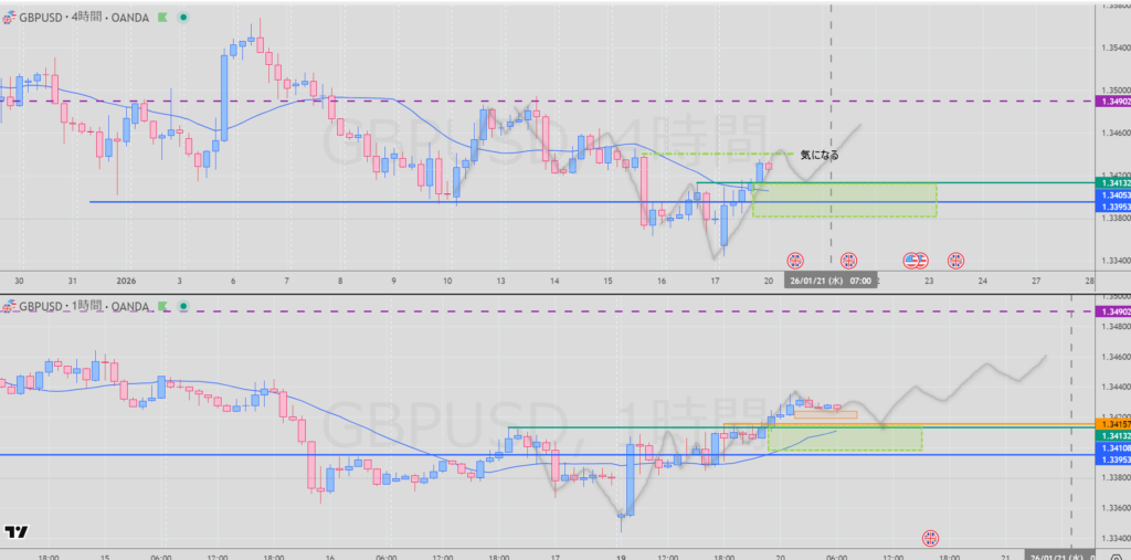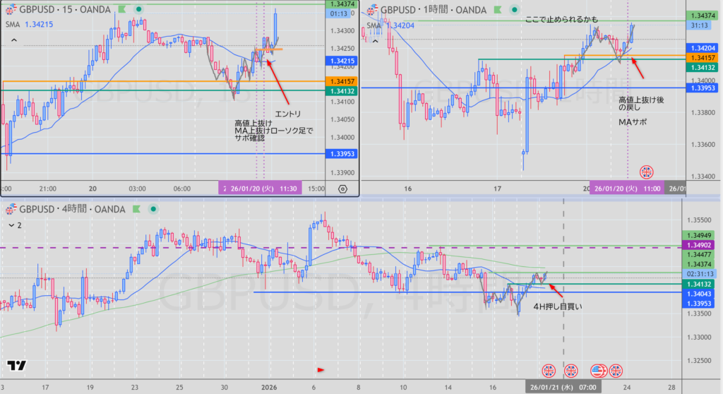 ∴上位足の売り勢力は気になるものの上昇の勢いがあるとみて、4H押し目買い