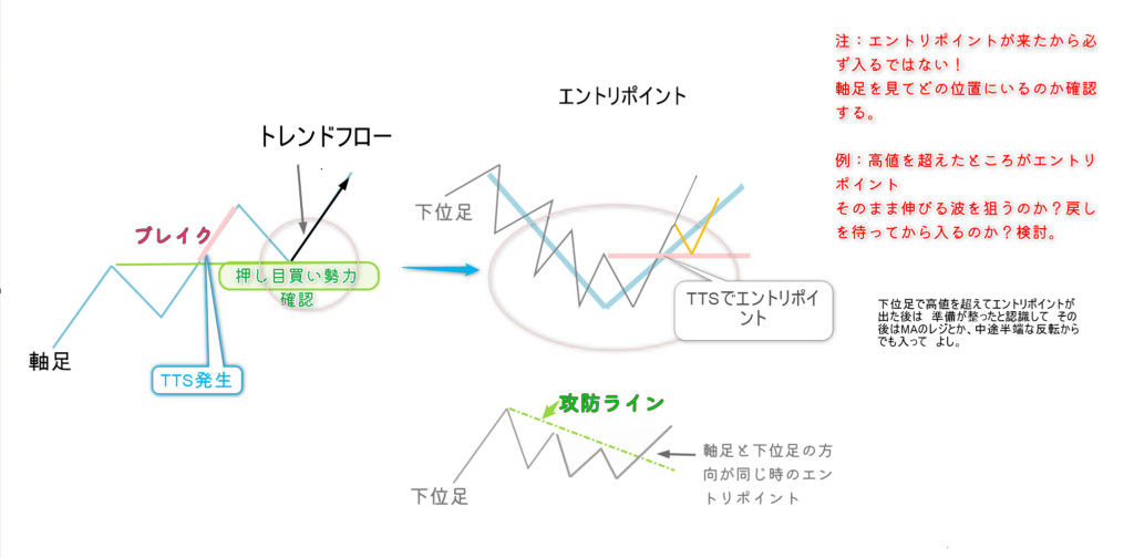 トレンドが出た後のライン間での場面の下位足での入り方と同じだった。