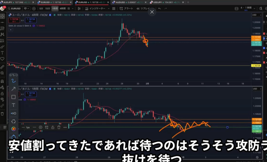 「4H,1H同時に安値を割ったら攻防ラインを引いて考えてみる」できてない・・・。