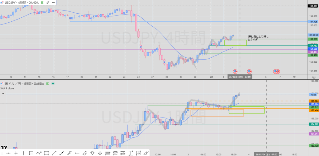 4H 1Hとも節目の判定が難い。