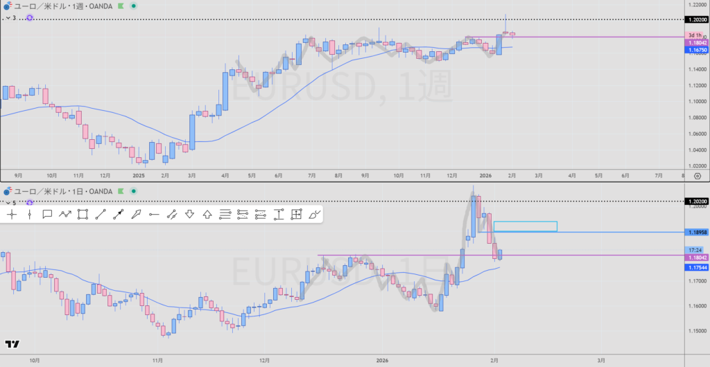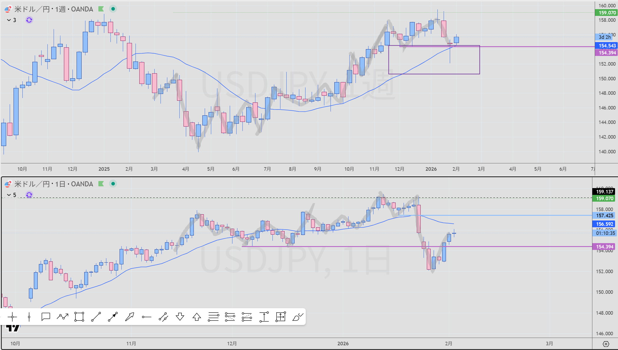 先週後半でほぼ流れは下?となっていたが金曜、週の始まり値まで上昇。