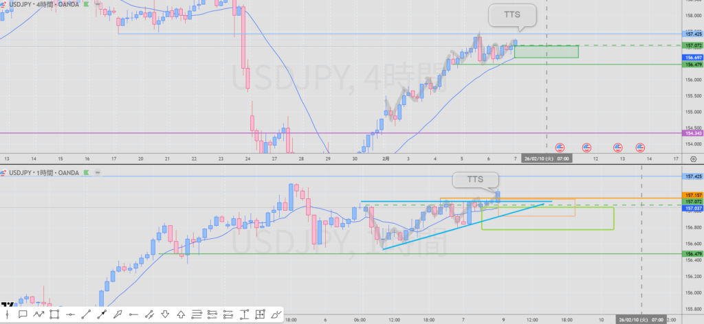 高値と安値でもみ合い後、売り抑えを上抜けた。TTS発生