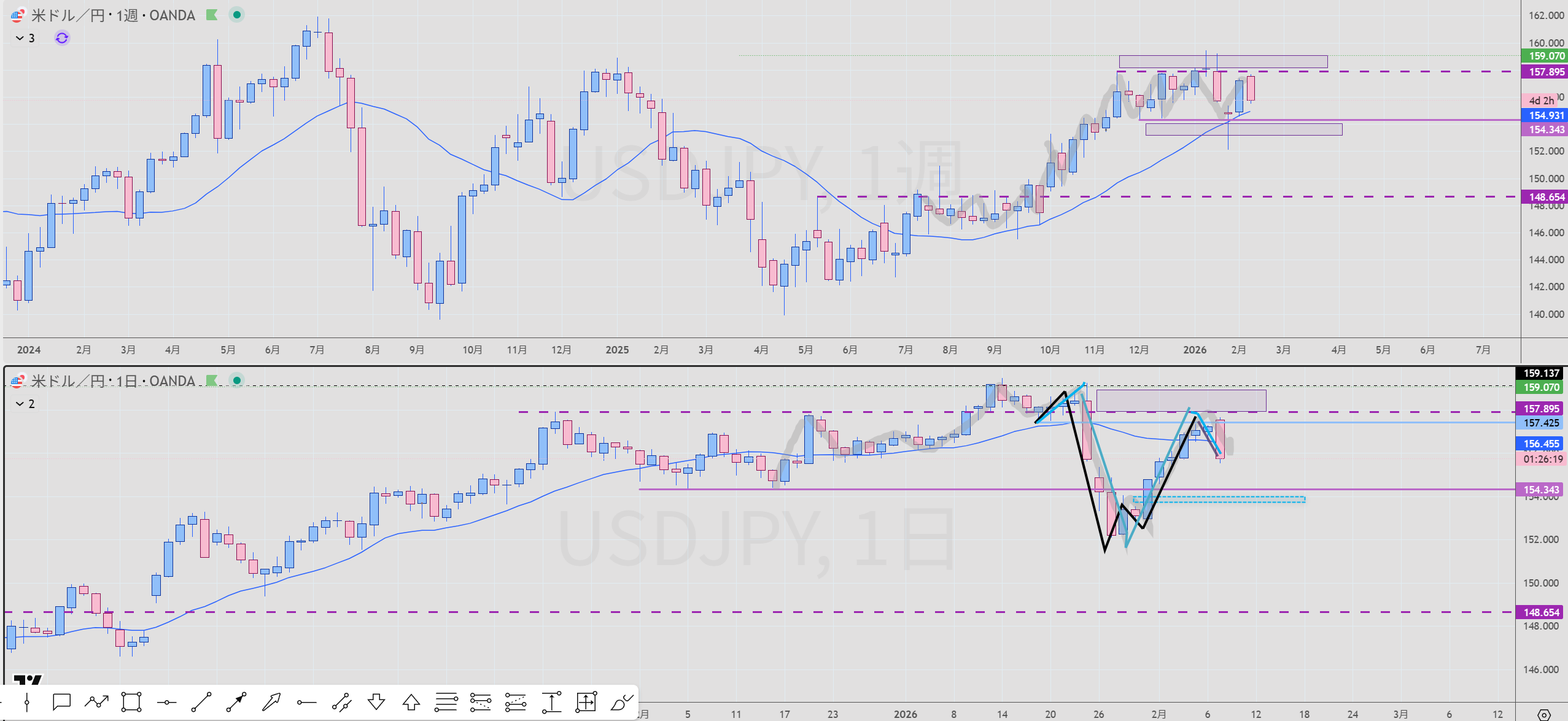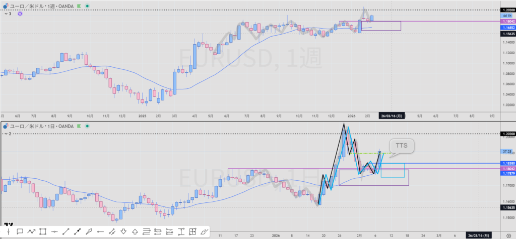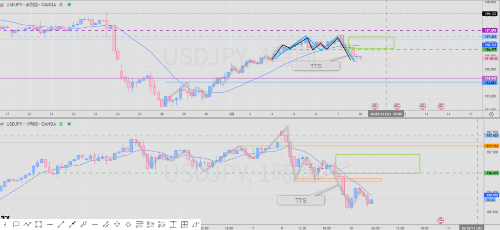 (日足のレジスタンスに止められ(青 日足のレジを背にダブルトップ))買い支えを下抜きTTS発生