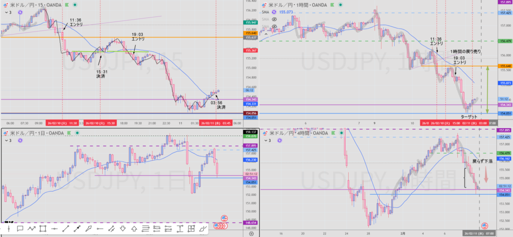 振り返り:4時間の下落の途中を1時間ので切り取ったトレードを2回した。