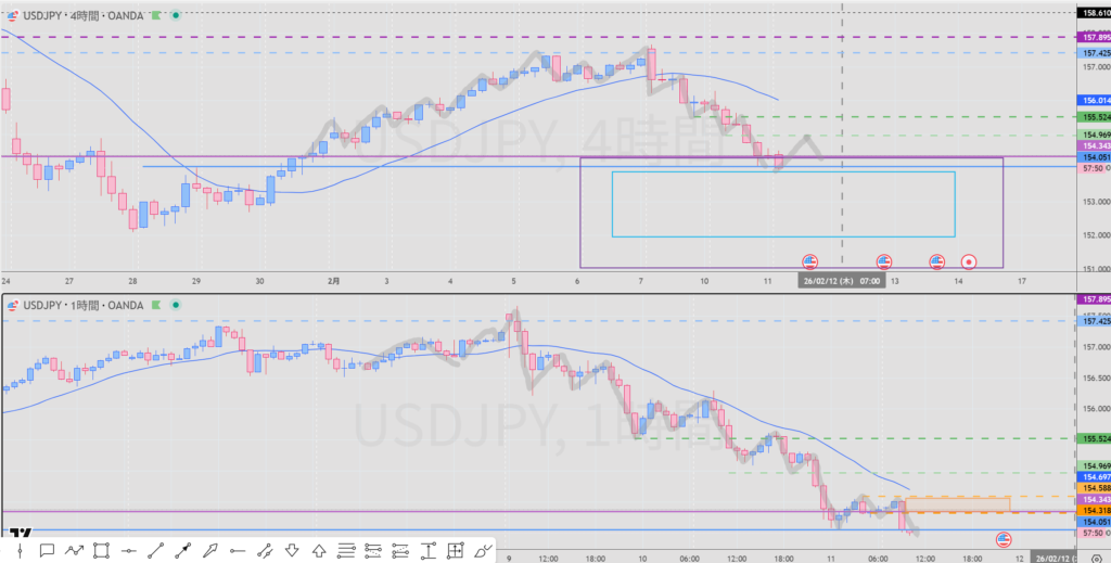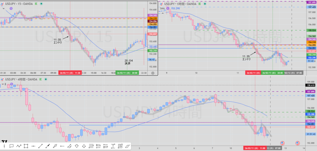 4Hの下落の波の途中を 1Hトレードに切り替える。