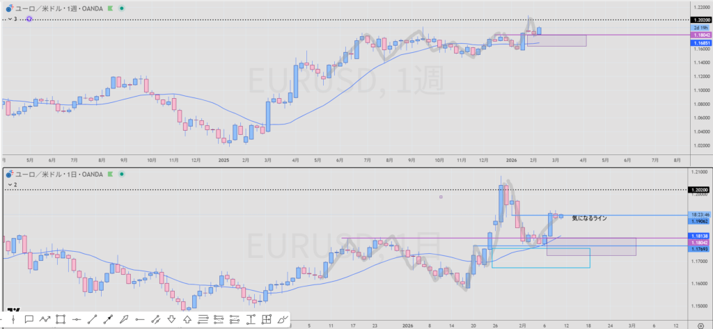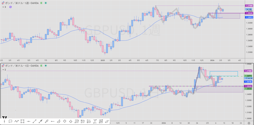 週足サポートから上昇(全戻し)。高値(売り抑え)とMAに挟まれている。