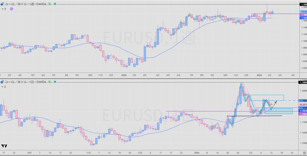 下降の途中であるが、ローソク足単位で、安値(買い支え)を実体で下に抜けられず調整中。(日足の安値圏
