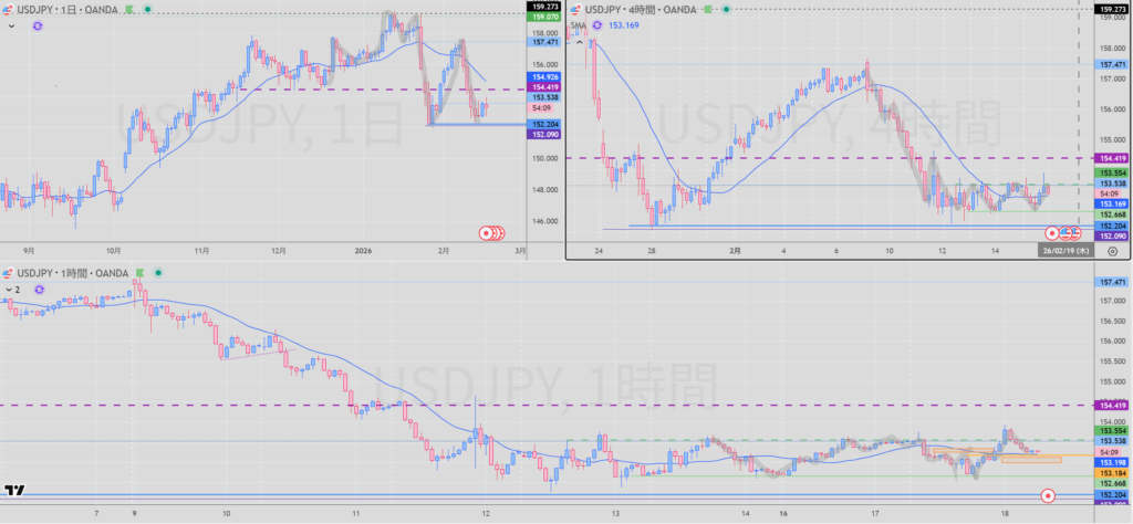 4H ローソク足MAの上に出てきたし今日は上にぬけるのでは?と観ていたが、すぐに売り抑えられ下降。横向きのMAを下抜け、安値まで下降。