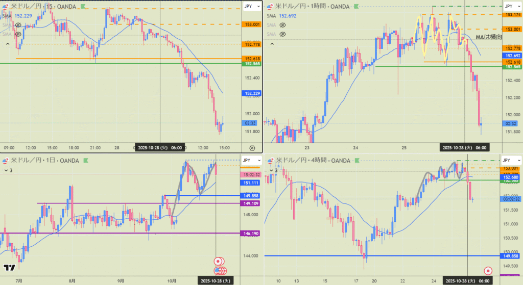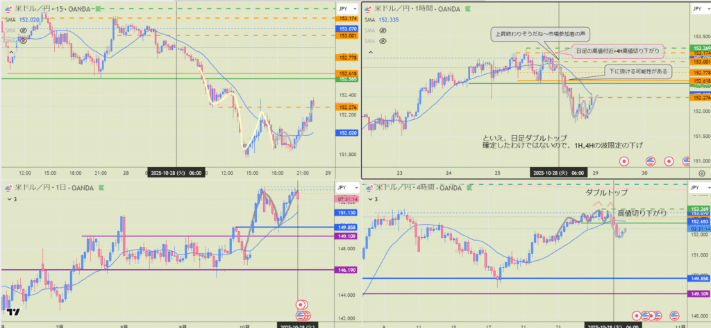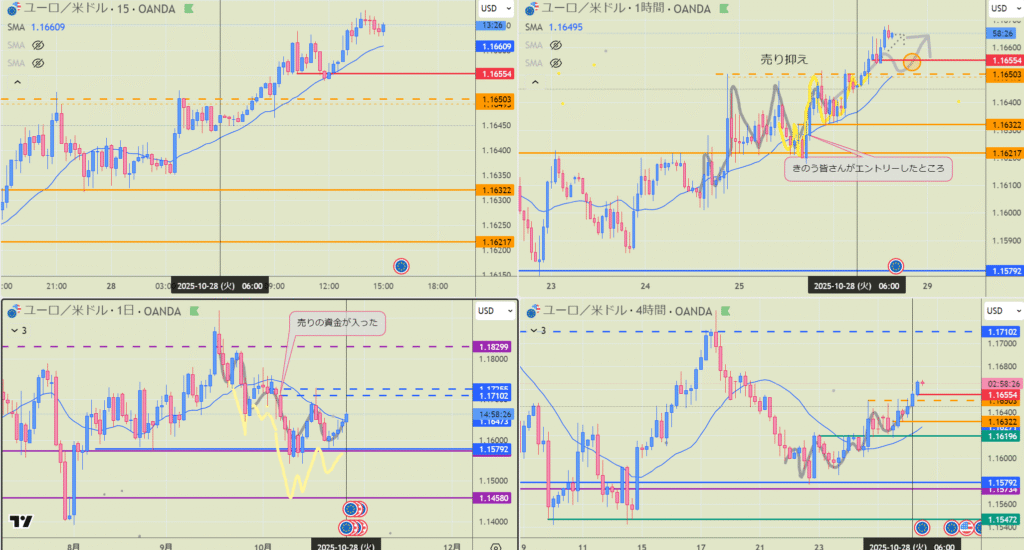 4時間で高値(売り抑え勢)を超えられるかどうかに注目。超えた場合 下位足がどう動くのか観察する。