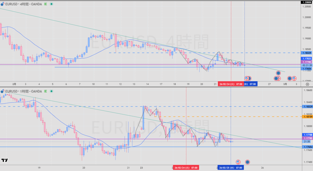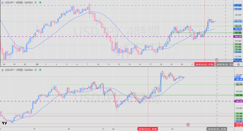 4H もどり売りから 下げ失敗 レジサポ転換 上昇(ファンだも影響あり高市総理利上げ難色)。