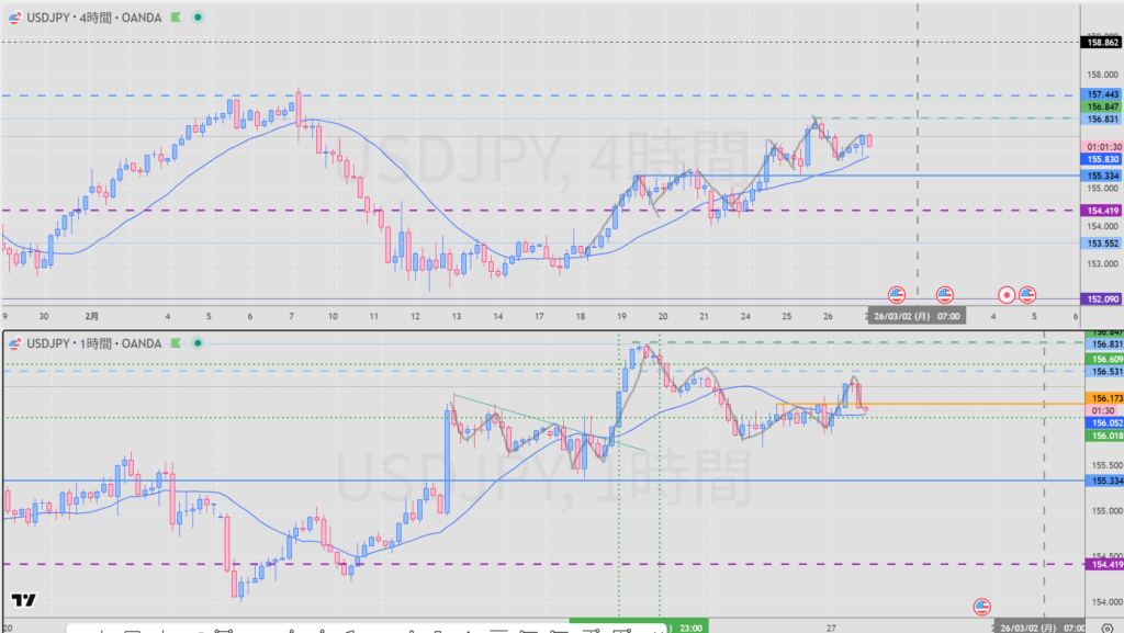 セオリーでは4H上昇の波の途中を下位足で買いを検討となるところ