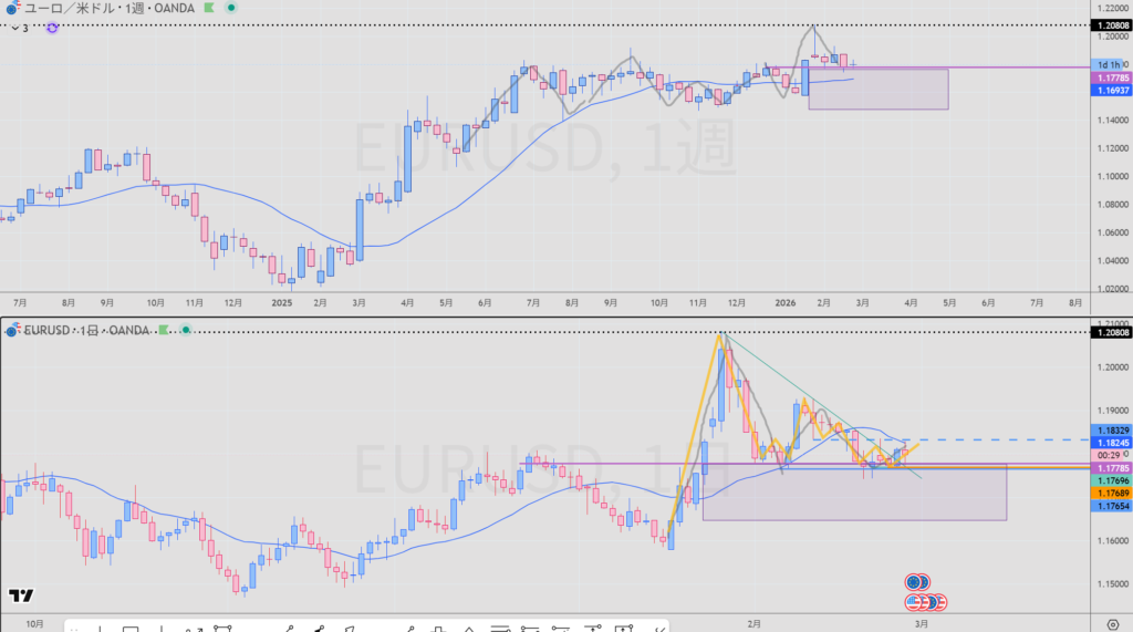 安値(戻り売り)を下抜け 日足安値 週足サポートから上昇 MAにとめられる?