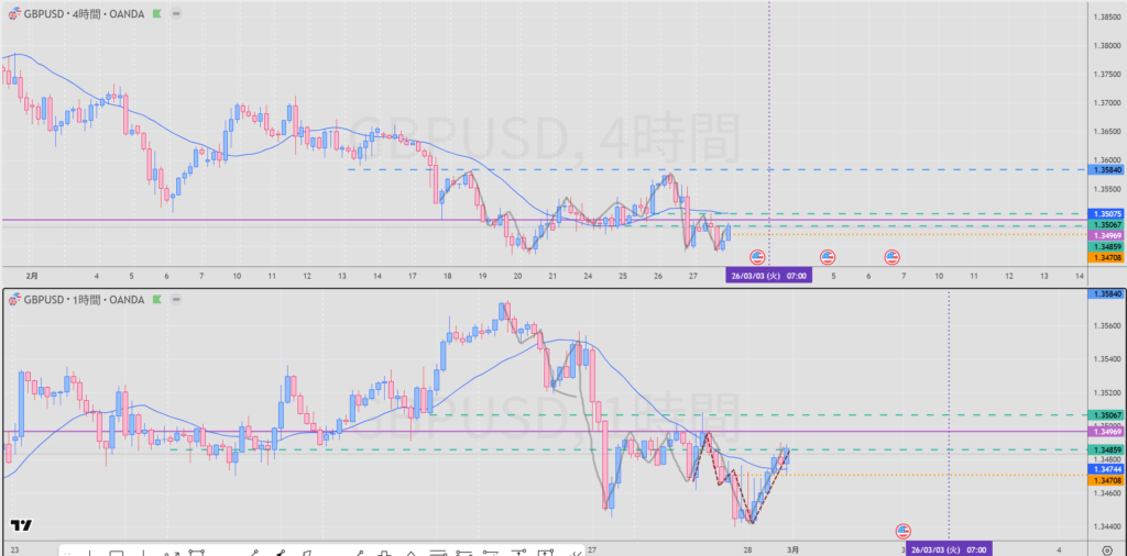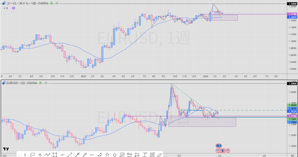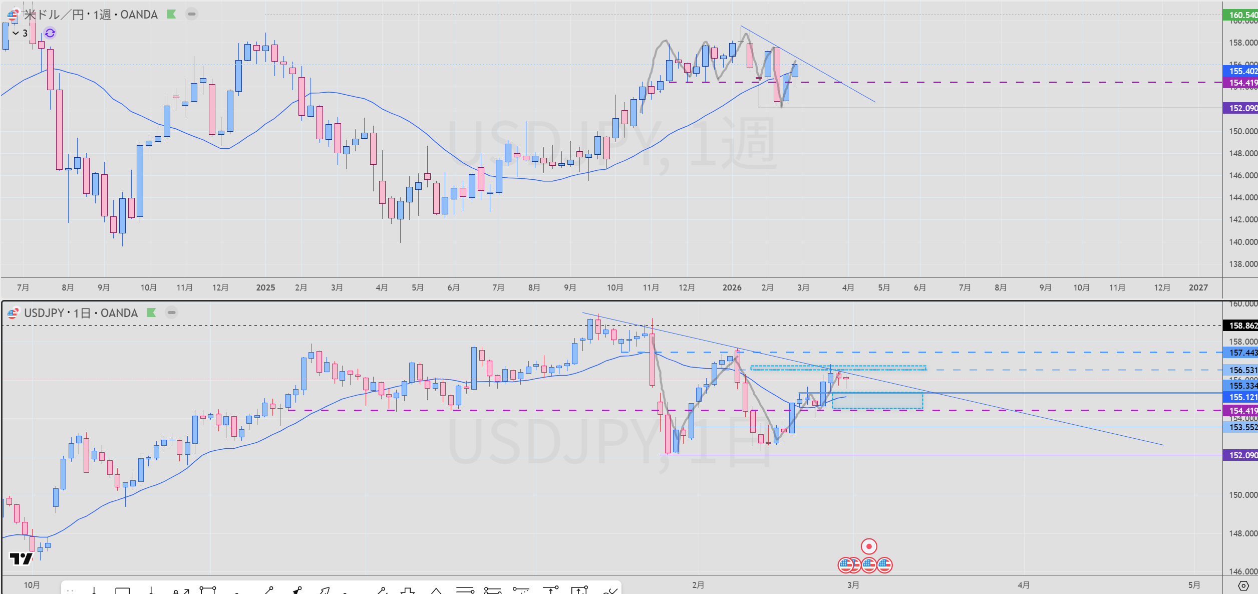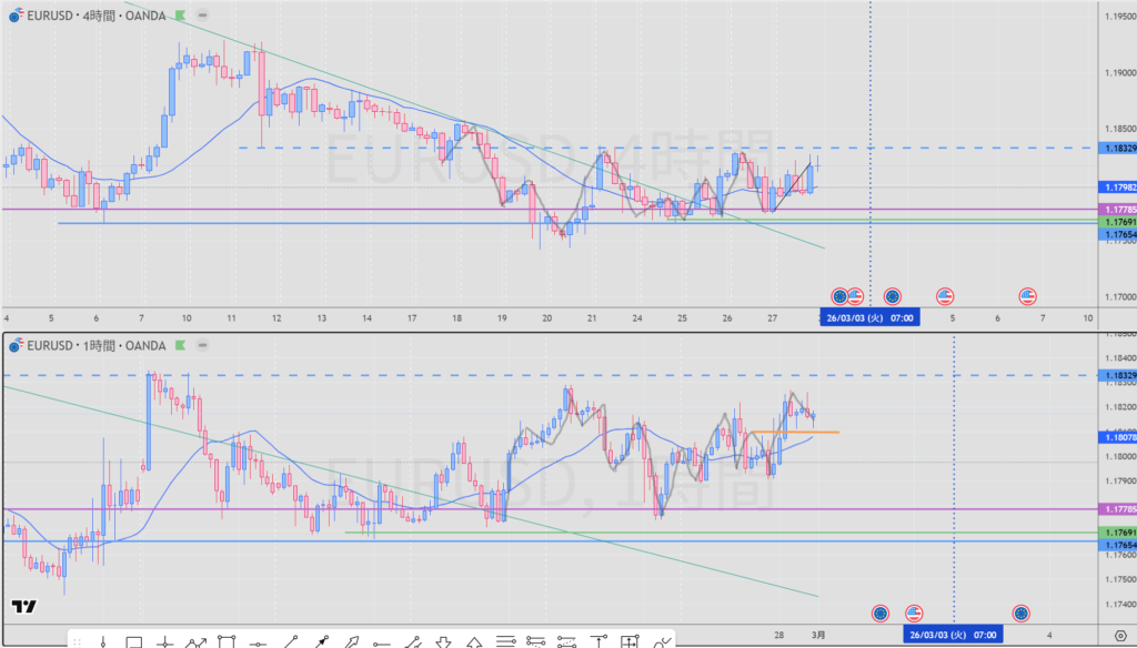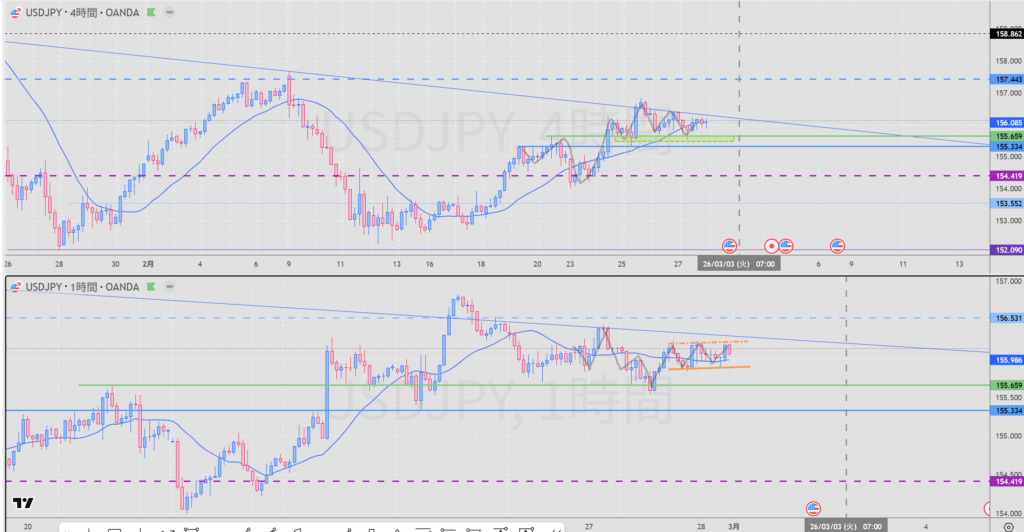 D上 WとDで喧嘩になりがち。下位足はうえ方向なんだけど、高値切り下がってきてるのが気になるところ。
