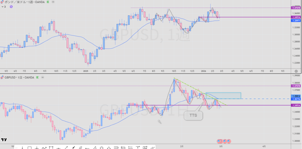 終値でラインを下にちょい抜けしているが下にいる気がする。