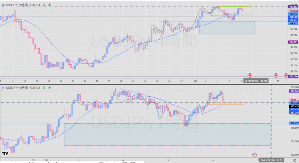 高値を上抜けすればTTS発生場面でもある。その場合4,4H同時抜けになると思われる。