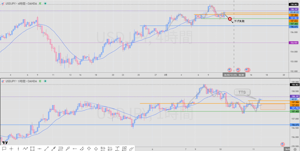 4Hの上昇の途中を1Hの押しを待つ。攻防ラインが引ける状態を待つ