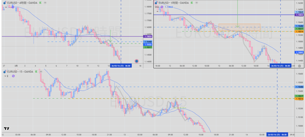 振り返り:4時間の下落の波の途中を 1時間の戻り売りを狙い 11時台にショートするも紫のラインが気になってしまい、欧州時間で4時間のMAが追いつくのならまた入ればいいやと思い決済してしまう。