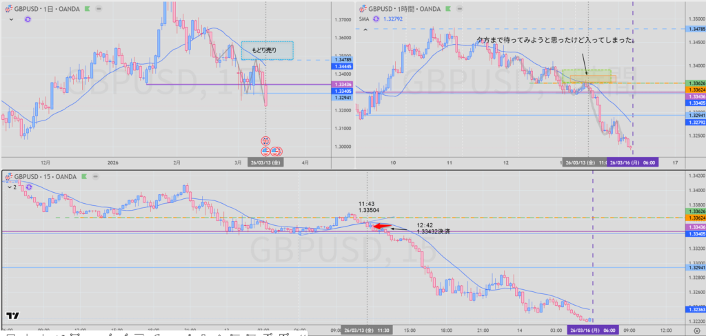 日足、4Hの下落の波の途中を1H戻り売り。