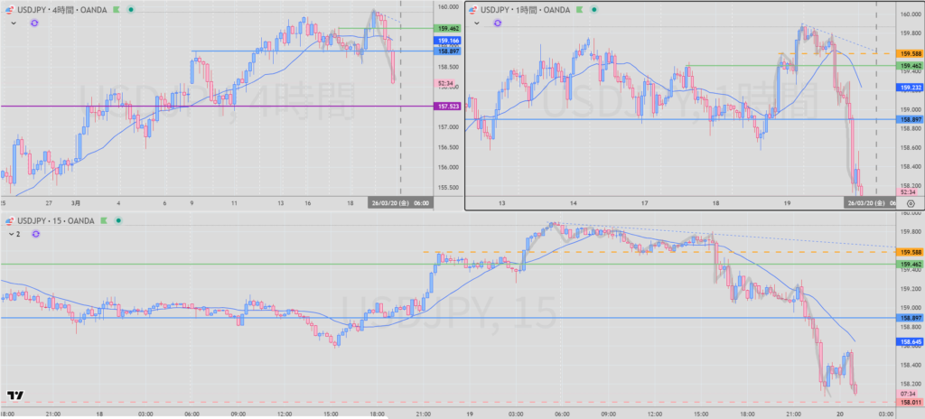 振り返ってみると4H戻り売り 1時間の戻り売り15分安値抜けでショートエントリできたのではないか?ただし利確は伸ばさない。