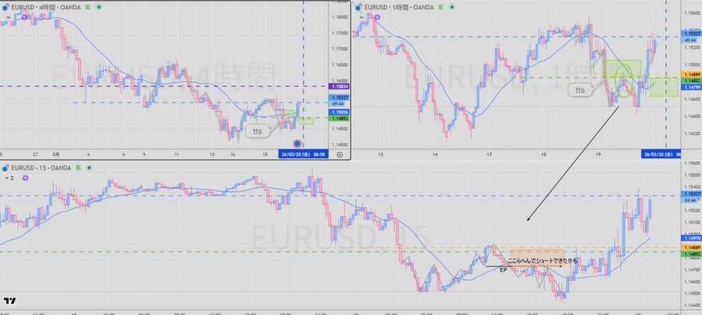 実際は仕事中細かく見ていなくて チャンスないな~ってな感じでスルーしたが、後から見ると4H,1Hの戻り売りで1時間の安値までサクッと取れたのではないか?