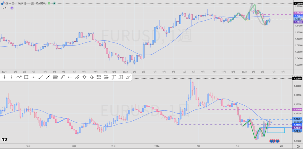4H青カウントすると戻り売り場面なのだが、違うカウントも取れる。