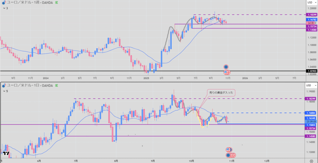 資金がどんと入った下降のきっかけになったところに売り抑えがいて止まっている。