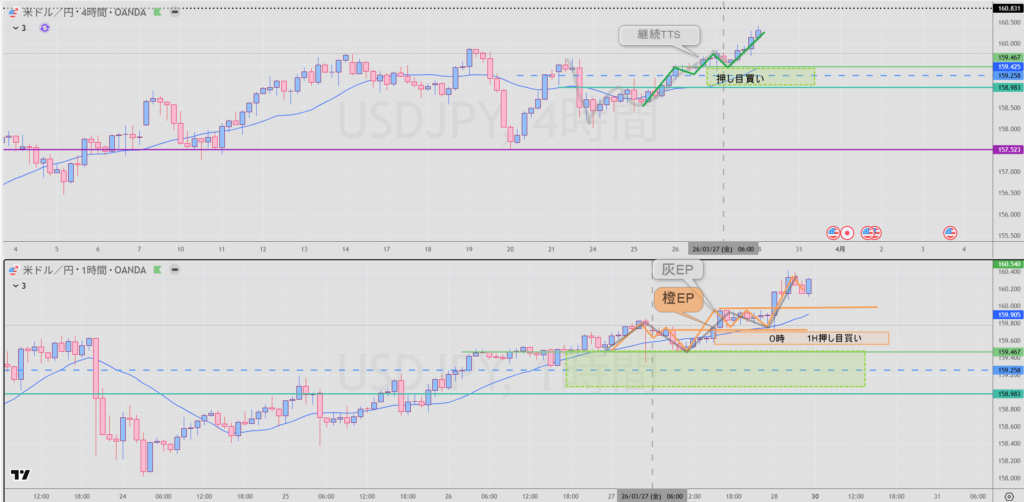 4H押しを待つか、4Hの上昇の波の途中を1Hの押し目買い。