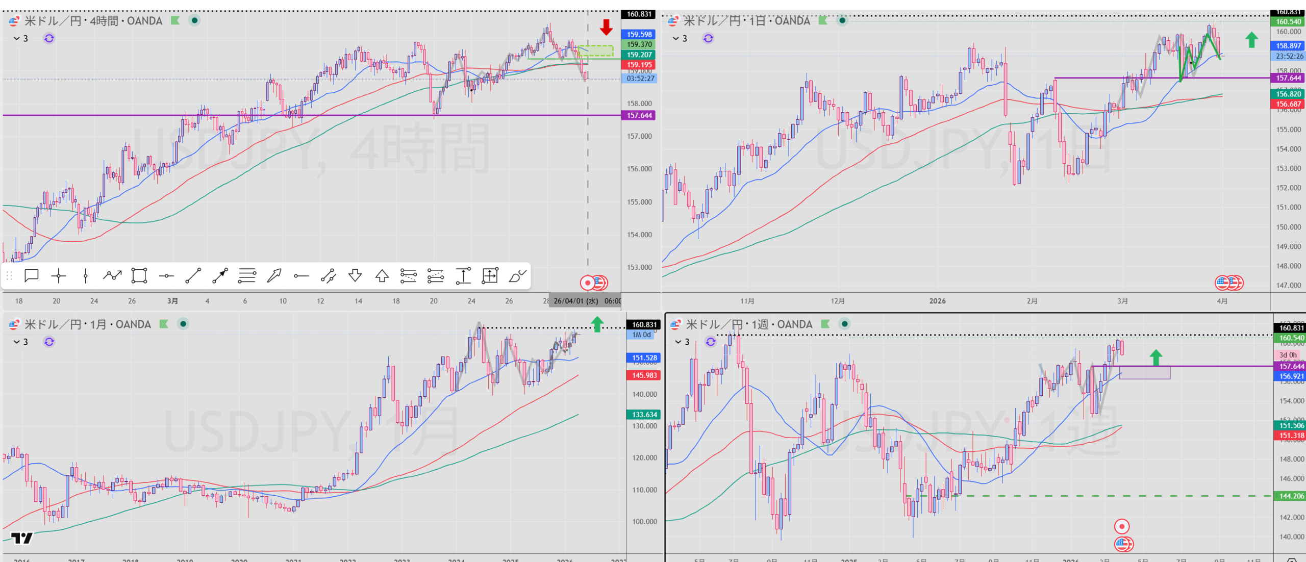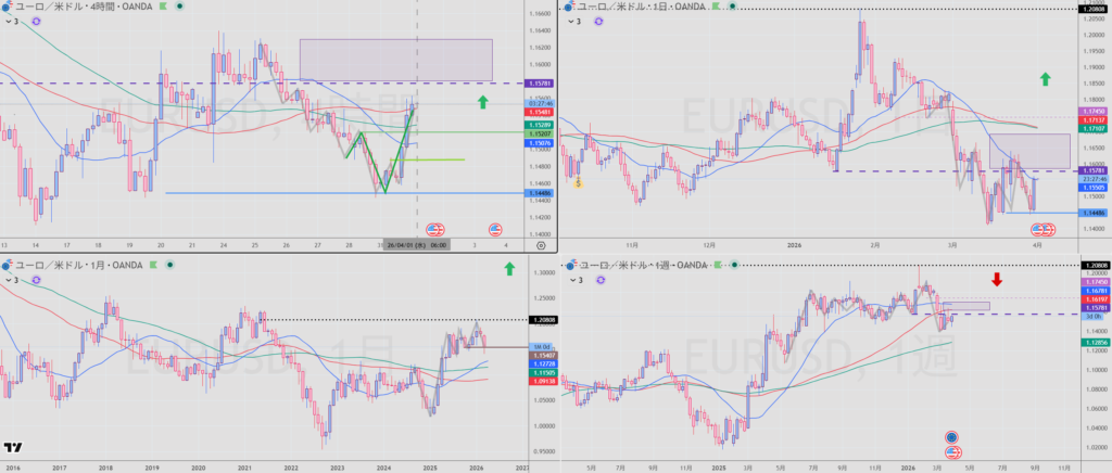 4H:上 上昇の波の途中。MA:下から横。
