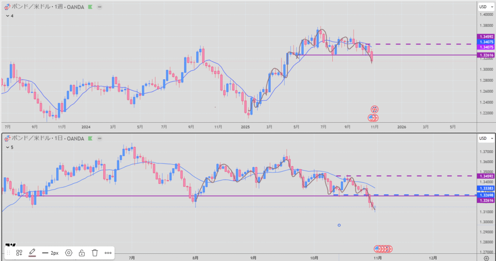 1時間:方向上だったので、上方向で見ていたが、横向きMAを下抜けて下方向へ。