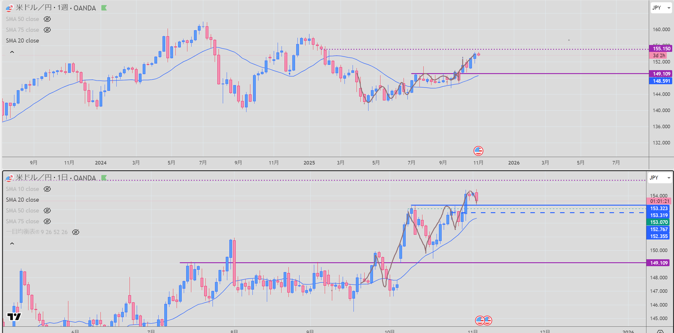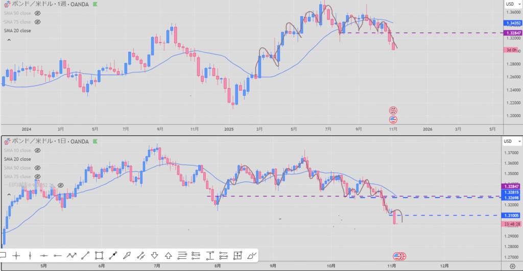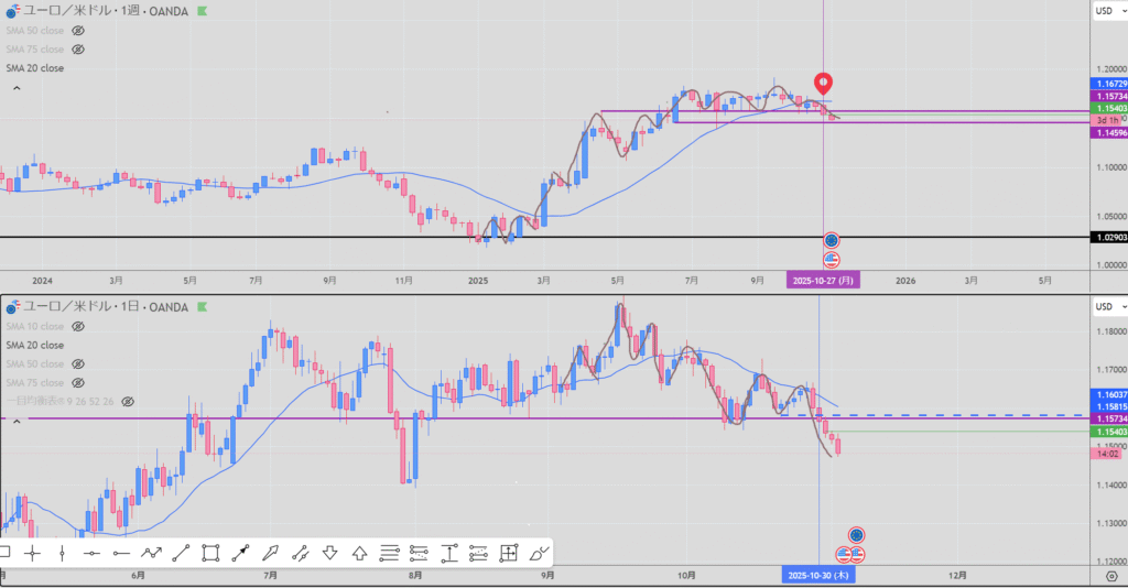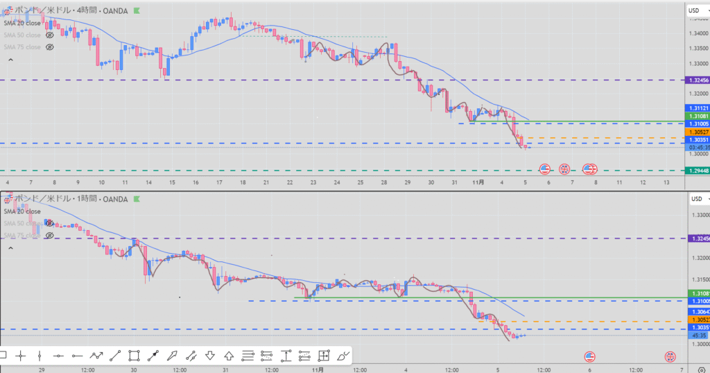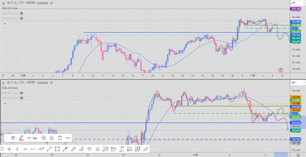 1時間で買い支えを下抜けるのであれば、1時間でのトレードを検討。