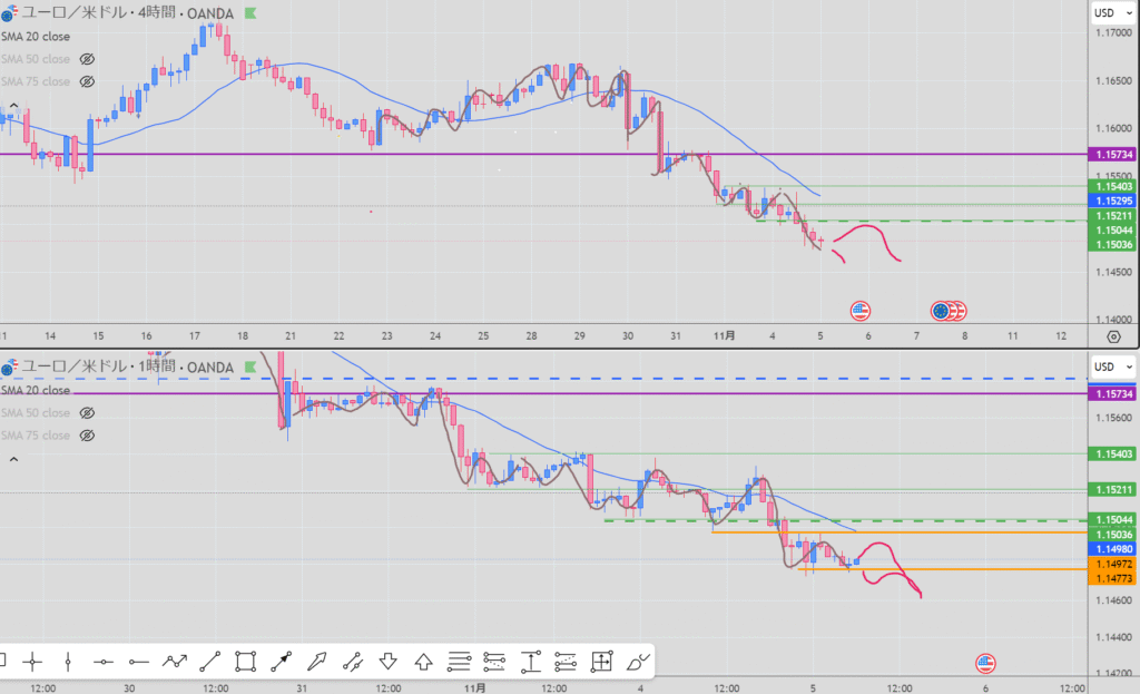 シナリオ:4H,1Hが戻り売りまで戻ったら売り検討。