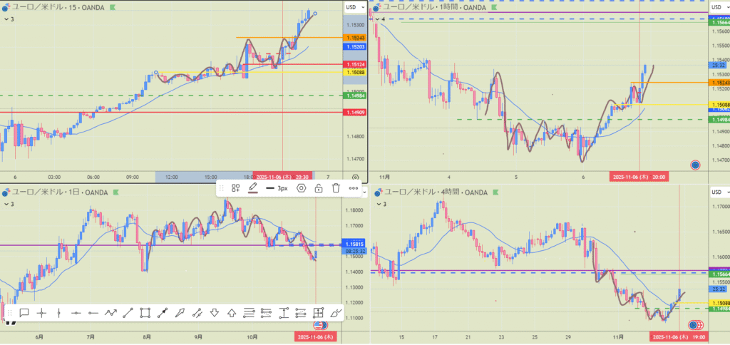 1H:高値(売り抑え)を上抜き上昇の波の途中。