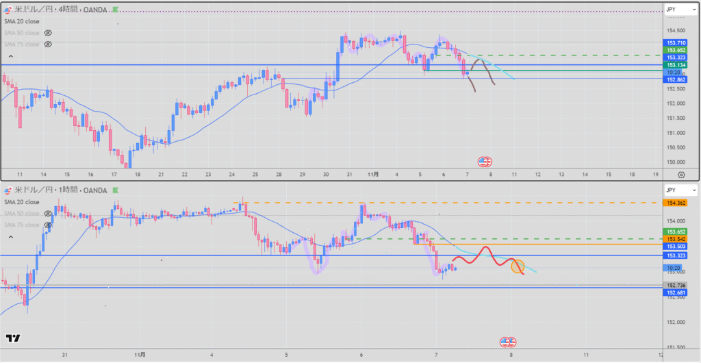 シナリオ:4H 上昇の波の途中を1Hの押目買いで考えるならば、4時間が伸びっぱな気がするし、1Hの戻り売り候補の戻しが浅い気がする。