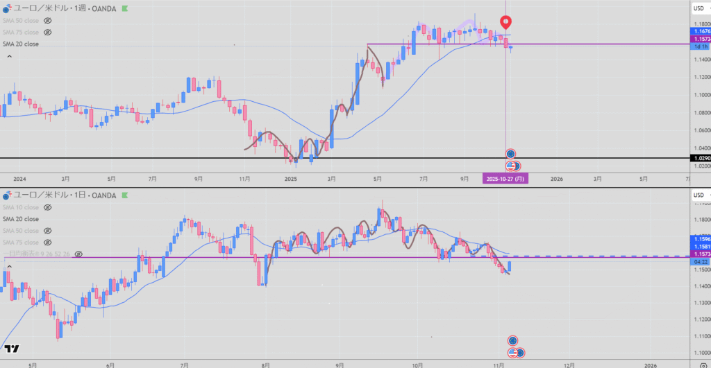 日足:安値(買い支え)を下に抜け下向きへ。