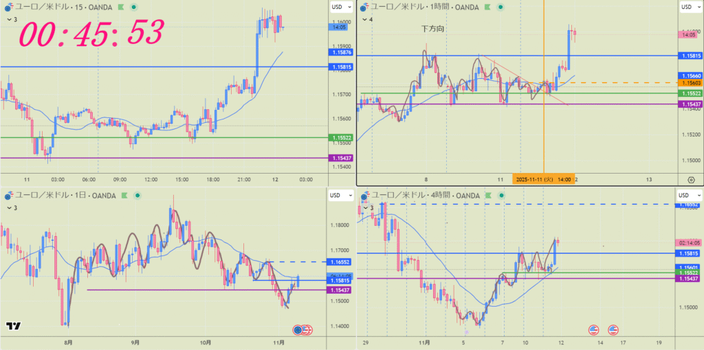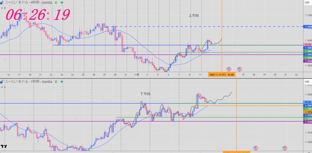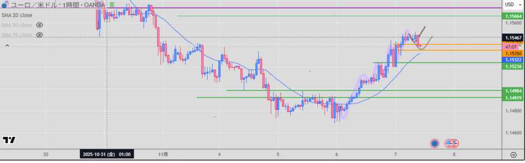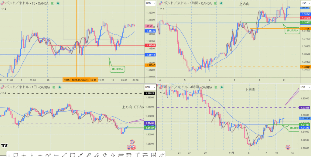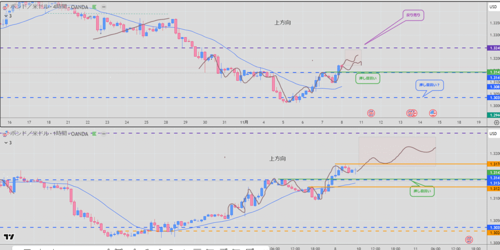 4Hの押し目で止まるなら押し目買い検討。と言いたいが。日足の売戻り売り&MAに抑えられているんので。どうしようw